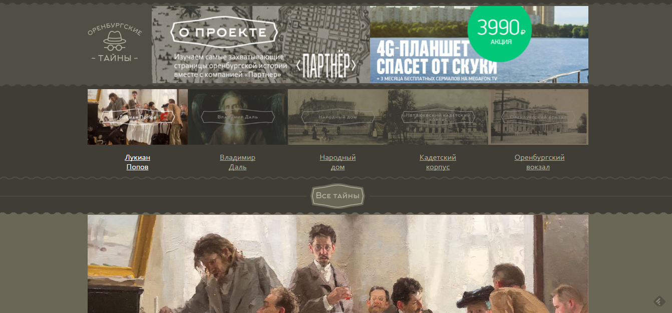 «Оренбургские тайны» — документальный исторический сериал, посвященный Оренбургу. Миссия проекта — популяризация истории города и края. Каждый месяц команда проекта исследует одну историческую тему и производит на основе нее фильм, состоящий из четырех серий. Итогом проделанной работы становятся медиапродукт о разгаданной «тайне», который презентуется на закрытом мероприятии для журналистов, затем выходит в эфир на телевидении и публикуется на информационном сайте, в социальных сетях.